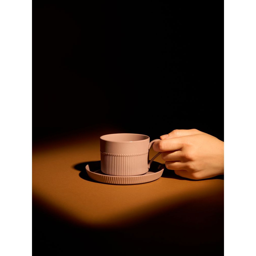 Орнамент корпуса кружки и высокого бортика блюдца напоминает изящные каннелюры — вертикальные желобки на колонне. Это добавляет всему изделию изысканности и стилистической завершенности, благородства и античной строгости.
