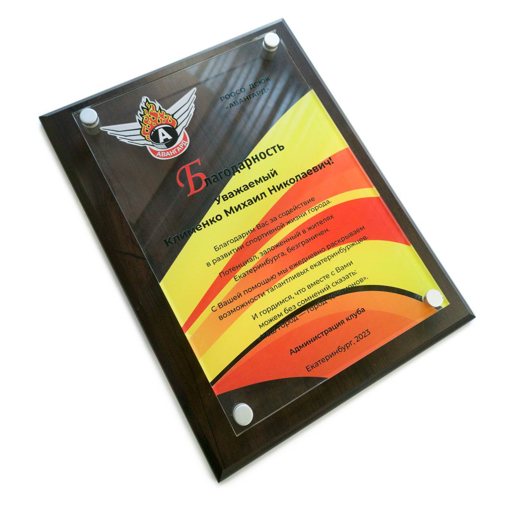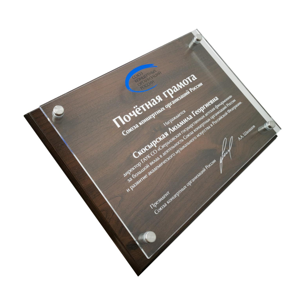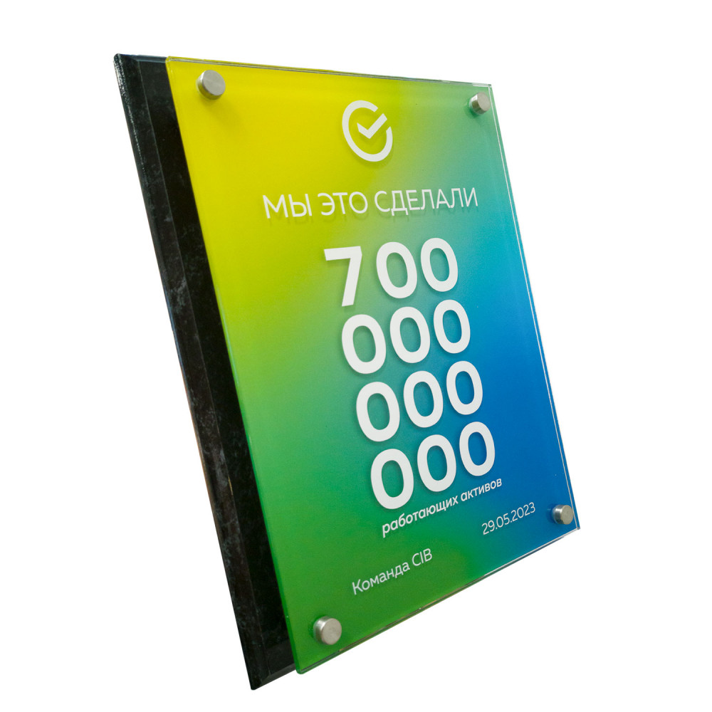 Основание плакетки выполнено из МДФ с покрытием под дерево или камень различных цветов. Изображение наносится непосредственно на основу методом УФ-печати. Данная технология позволяет получить детализированное изображение с точно переданными цветами и оттенками. Элементы из акрила вырезаются лазером и крепятся к плакетке с помощью дистанционных держателей. За счет того, что дополнительные элементы располагаются на расстоянии от основы, плакетка имеет объемный и оригинальный вид.