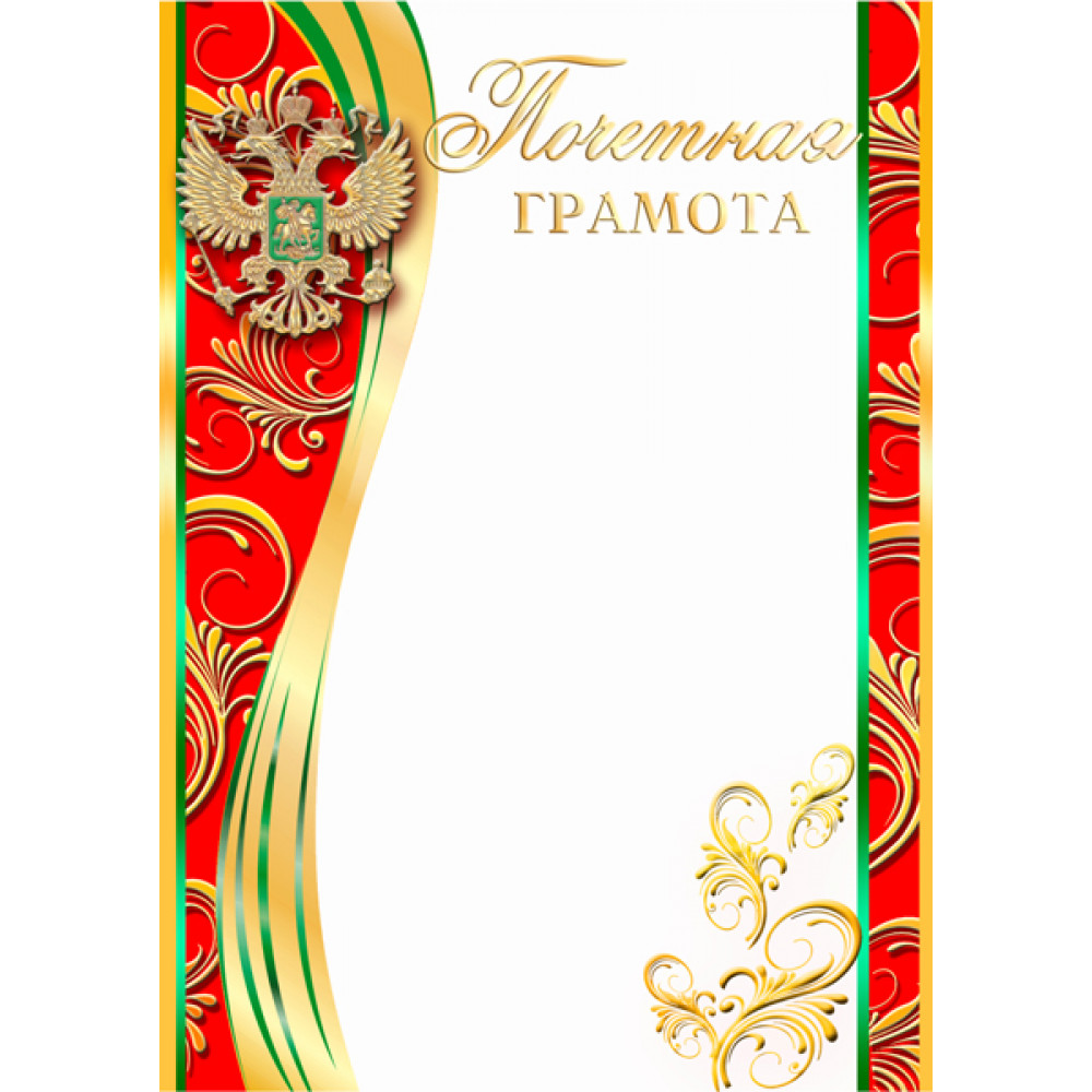 Грамота, формат А4. Бумага матовая, толщина 200 гр, полноцветная печать. ¶Фон грамоты красно-золотой. По центру грамоты белый фон для нанесения персонализации. В верхней части белого фона написано "Почетная грамота", слово почетная написано курсивом, цвет золотой. Правая сторона белого фона прямая, левая - волнистая. По края грамоты изображена красно-золотая хохлома, так же изображены тонкие изумрудные полосы, в верхнем левом углу изображен российский герб золотым цветом.