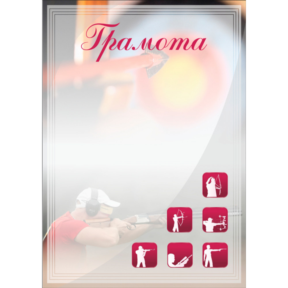 Грамота, формат А4. Бумага матовая, толщина 200 гр, полноцветная печать.¶На грамоте изображён стрелок из ружья, в белой кепке, черных наушниках и красной футболке, так же крупным планом изображена мишень. Поверх изображение наложен прозрачный фон для нанесения персонализации, закрывающий практически всю поверхность грамоты, за исключением тонкого канта. В верхней части написано слово "Грамота" красным цветом, шрифт курсивный. В нижнем правом углу изображены 6 квадратов с округлыми углами, внутри которых силуэты стрелков из лука, ружья, пистолета. Цвет красный. Изображены в следующем порядке: нижняя линия три квадрата, посередине - два квадрата и на вершине - один.