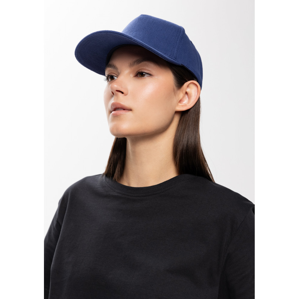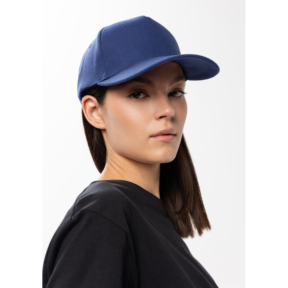 Бейсболка-пятиклинка без лобового шва с изогнутым жестким козырьком. Посадка регулируется ремешком на металлической застежке.