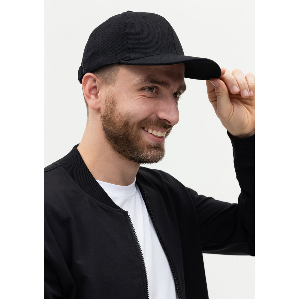 Бейсболка-шестиклинка с изогнутым жестким козырьком, прилегание регулируется ремешком с металлической застежкой.