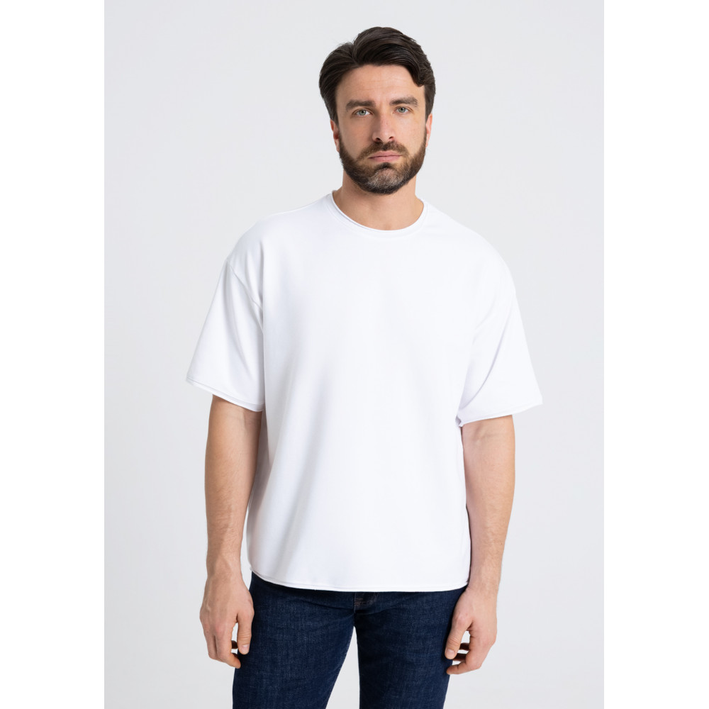 Футболка oversize-силуэта со спущенной линией плеча и необработанным краем рукава, горловины и по низу изделия.