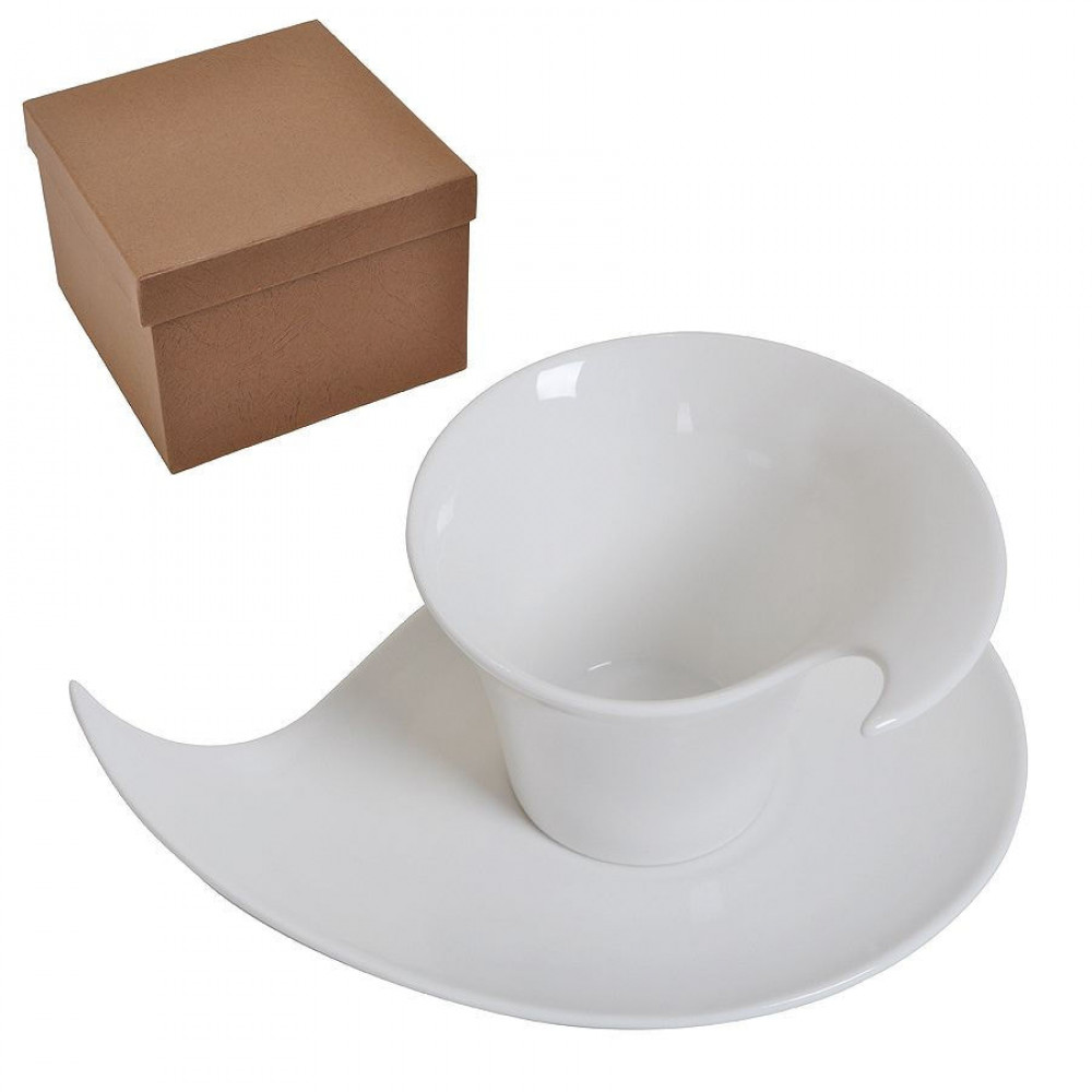 Необычная форма чашки повторяется в такой же форме блюдца: как будто при перемешивании чайной ложечкой закручивается вихрь вкуснейшего чая или кофе.