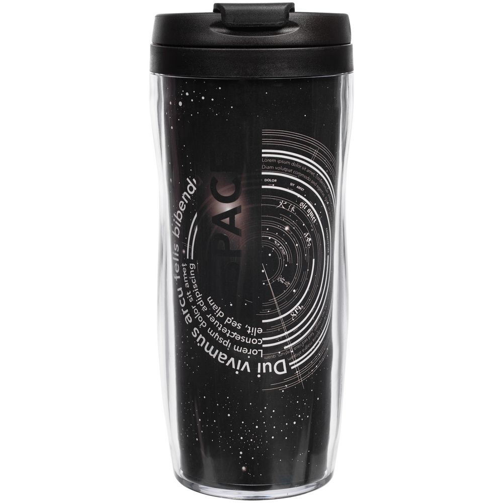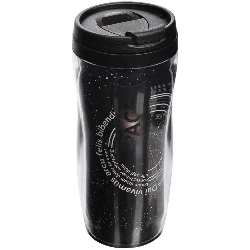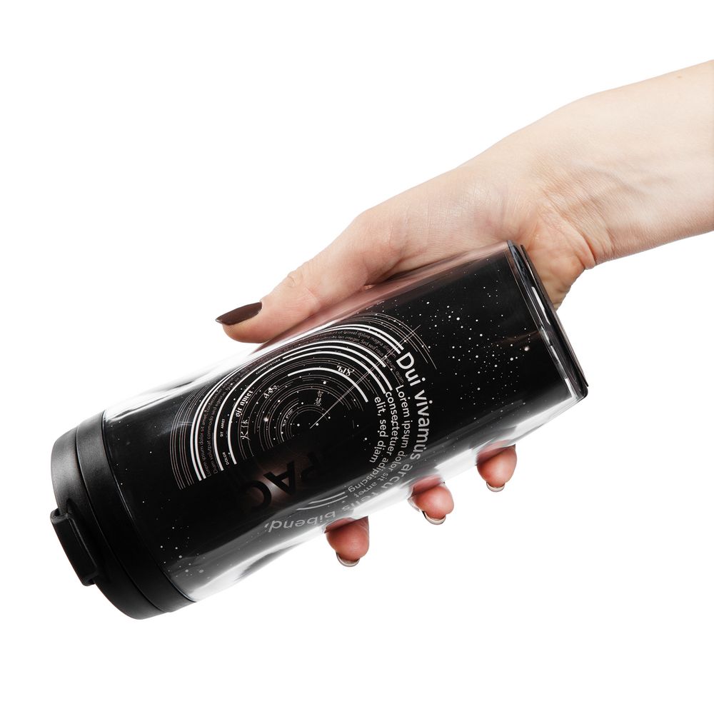 Отличный рекламоноситель с огромным полем печати — можно разместить не просто логотип, а целую историю. Полноцветная вставка занимает всю поверхность стакана и смотрится очень органично. Для сборки и разборки не требуются клей или специальные инструменты — изображение помещают в пространство между внешним и внутренним слоями корпуса, части которого скрепляют с помощью скрытого в дне стакана резьбового соединения.