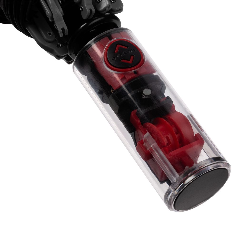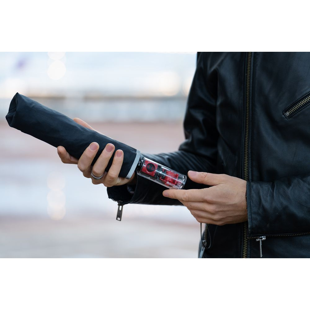 Складной зонт Futurum привлекает внимание оригинальным дизайном. Складываясь после дождя, он прячет мокрую поверхность в себя, а сухая остается снаружи. Светоотражающий кант и ручка из прозрачного пластика, не скрывающая ярких деталей внутри, добавляют внешнему виду зонта футуристичности.